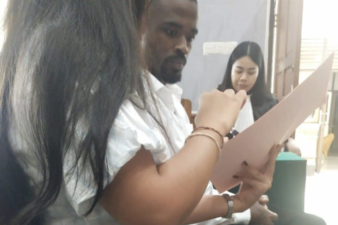 Terdakwa Ifeanyi Ronel Okoronkwo ditemani penerjemah saat sidang di Pengadilan Negeri Denpasar, Kamis (29/1). (BP/istimewa)