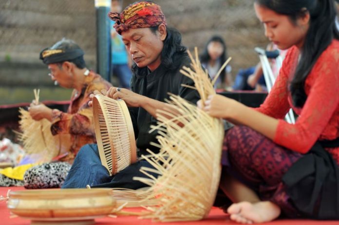Sejumlah perajin tengah menganyam bambu untuk tempat buah. (BP/eka)
