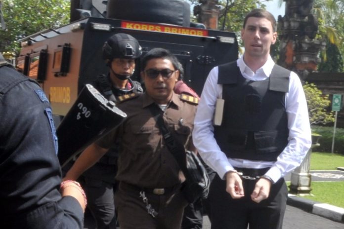 Terdakwa Darcy Francesco Jenson saat tiba di Pengadilan Negeri Denpasar untuk mengikuti sidang dengan agenda pembacaan tuntutan, Senin (2/2). Terdakwa disidangkan terkait kasus penembakan terhadap warga Australia di Munggu, Badung.(BP/eka)