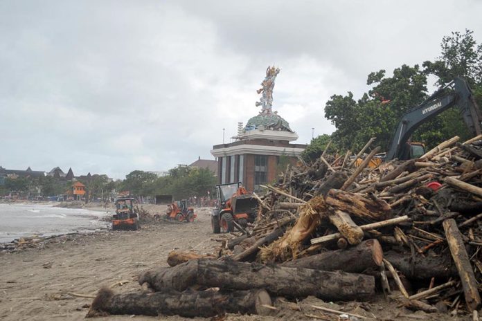 Alat berat memindahkan tumpukan kayu yang terdampar di Pantai Kuta, Badung, Selasa (20/1). Sampah dan kayu terdampar di pantai ini merupakan fenomena musiman yang sering terjadi akibat cuaca ekstrem dan arus laut. (BP/eka)