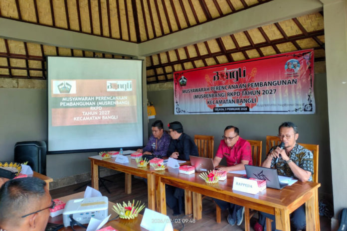 Musrenbang RKPD Kecamatan Bangli Tahun 2027 yang digelar di Penglipuran Selasa (3/2) dihadiri berbagai pihak mulai dari anggota DPRD Dapil I Bangli, perwakilan Kapolsek, Danramil, Badan Pusat Statistik (BPS), perwakilan Perangkat daerah (PD), Perbekel, Lurah, MDA Kecamatan, PHDI Kecamatan, TP PKK Kecamatan, TP Posyandu Kecamatan, serta forum pemuda. Dalam kegiatan itu perwakilan Bappeda Litbang Kabupaten Bangli, juga menguraikan arah kebijakan pembangunan pemerintah daerah untuk tahun 2027. (Dayu Swasrina/balipost)