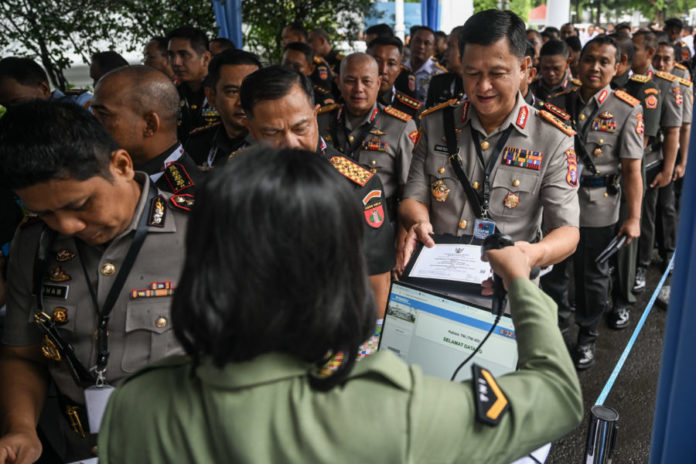 Sejumlah perwira tinggi dan menengah TNI dan Polri antre masuk untuk mengikuti rapat pimpinan (Rapim) TNI-Polri di Kompleks Istana Kepresidenan, Jakarta, Senin (9/2/2026). (BP/Antara)