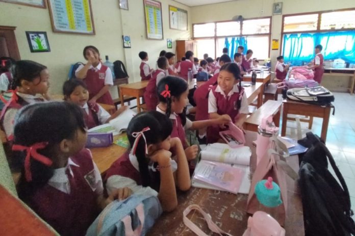 Para siswa menyiapkan buku pelajaran sambil menunggu pembelajaran mulai di salah satu SD di Denpasar. (BP/eka)