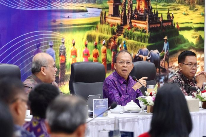 DENPASAR, BALIPOST.com – Gubernur Bali, Wayan Koster menegaskan penerapan Ekonomi Kerthi Bali menjadi fondasi utama agar Bali mampu berdikari secara ekonomi sekaligus berdaulat di bidang pangan. Hal tersebut disampaikan saat membuka High Level Meeting Tim Pengendalian Inflasi Daerah (TPID) dan Tim Percepatan dan Perluasan Digitalisasi Keuangan Daerah (TP2DD) Provinsi Bali, di Auditorium Bank Indonesia Perwakilan Bali, Denpasar, Selasa (10/2).