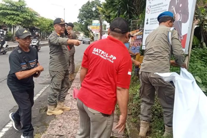 Satpol PP saat menertibkan baliho yang merusak keindahan wilayah perkotaan Kota Denpasar. (BP/Istimewa)
