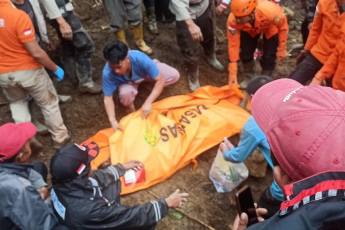 Petugas gabungan bersama warga melakukan upaya pencarian korban longsor di Suter (BP/Istimewa)