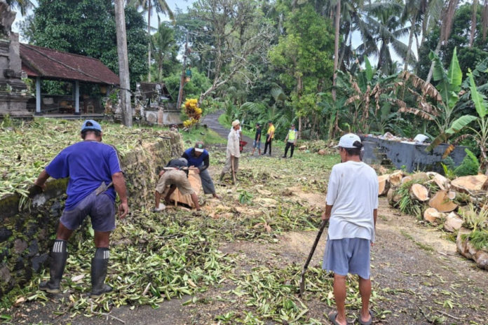 Penanganan pohon tumbang yang menimpa pura di wilayah Kabupaten Tabanan. (BP/istimewa)