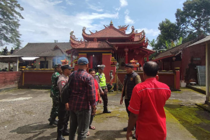 Polres Bangli mengamankan jalannya persembahyangan Tahun Baru Imlek 2577 di sejumlah Konco/Klenteng di Bangli, Selasa (17/2). (BP/istimewa)