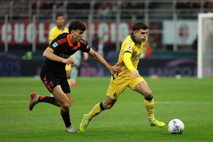 Pemain AC Milan, Cristian Pulisic (kanan) mencoba melewati gelandang Como 1907, Martin Baturina dalam pertandingan Liga Italia 2025/26 di Stadion San Siro pada Rabu (18/2). (BP/Dok. ACMilan.com)