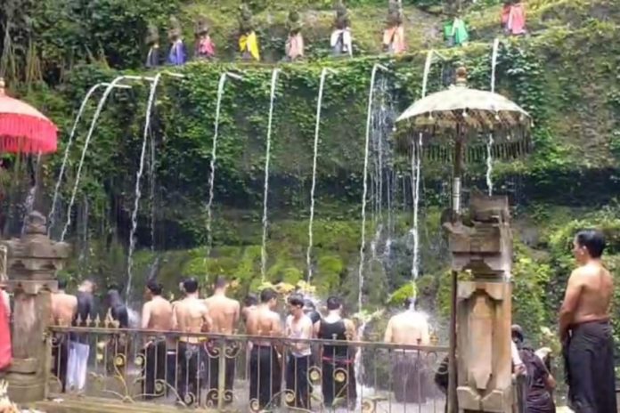 Sejumlah pamedek melukat di Tirta Sudamala, Kelurahan Bebalang, Bangli. (BP/istimewa)