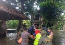 Sejumlah petugas melakukan penanganan banjir di salah satu wilayah Tabanan pada Senin (23/2). (BP/Istimewa)