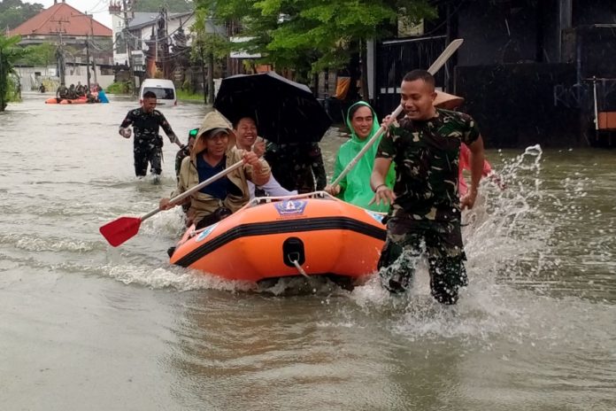 Petugas gabungan melakukan evakuasi warga dan wisatawan yang terjebak banjir di wilayah Badung pada Selasa (24/2). (BP/eka)