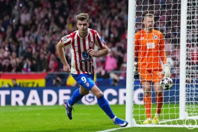 Penyerang Atletico Madrid, Alexander Sorloth (kiri) mencetak gol keduanya dalam pertandingan leg kedua playoff Liga Champions 2025/26 lawan Club Brugge di Metropolitano pada Selasa (24/2). (BP/Dok. UEFA.com)
