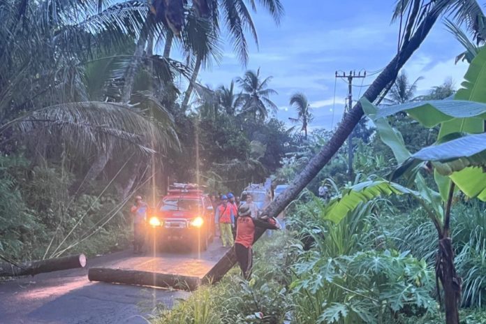 Kalaksa BPBD Klungkung, I Putu Widiada, S.H, Kamis (26/2) mengatakan bencana alam berawal hujan lebat disertai dengan angin kencang. Pohon kelapa tersebut tepatnya berada pada sisi timur jalan, dan berdiri pada kemiringan tanah.
