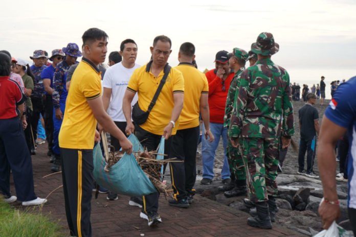 Tidak hanya aparat keamanan, antusiasme juga terlihat dari para pelajar dan warga Desa Adat Lembeng yang turun langsung memungut sampah plastik dan limbah organik di sepanjang pesisir pantai.