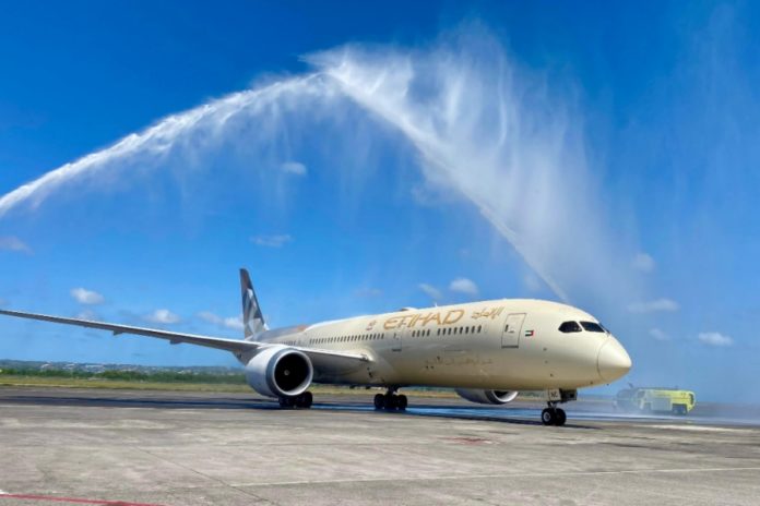Maskapai Etihad Airways mendarat perdana di Bandara I Gusti Ngurah Rai, Badung, Bali pada 26 Juni 2024. (BP/Istimewa)