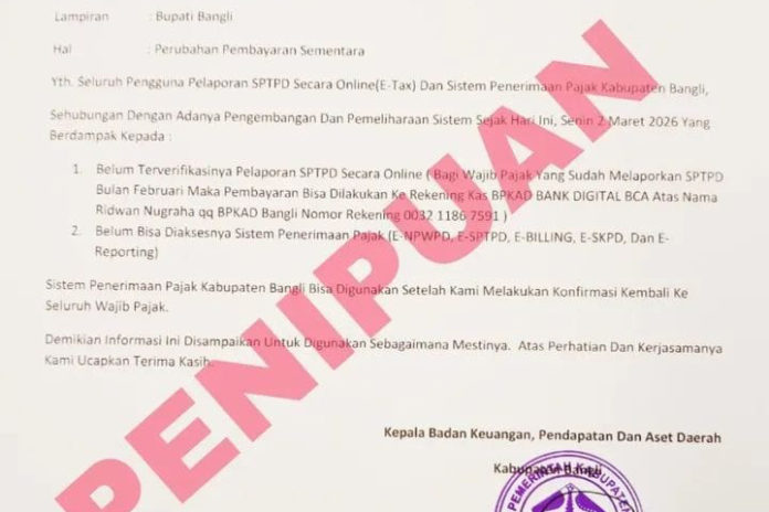 BANGLI, BALIPOST.com – Wajib pajak di Kabupaten Bangli diminta mewaspadai surat palsu yang mengatasnamakan Badan Keuangan, Pendapatan dan Aset Daerah (BKPAD). Surat tertanggal 2 Maret 2026 tersebut berisi arahan agar wajib pajak menyetorkan pajak ke rekening pribadi dengan dalih pemeliharaan sistem.
