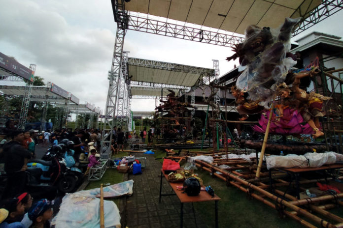 Cuaca buruk juga membuat proses perakitan ogoh-ogoh “Prayatna” sempat tertunda. Sejumlah bagian karya tersebut diamankan terlebih dahulu di area parkir Gedung Giri Nata Mandala sambil menunggu hujan mereda hingga dini hari.