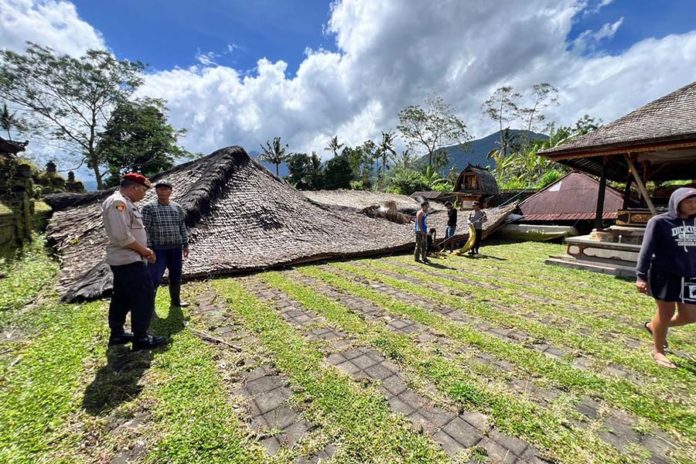 SINGASANA, BALIPOST.com – Terjangan angin kencang merobohkan sejumlah bangunan suci di Kahyangan Jagat Pura Luhur Pucak Tinggah, Banjar Angseri, Desa Angseri, Kecamatan Baturiti, Kamis (5/3) sekitar pukul 13.00 WITA. Peristiwa tersebut mengakibatkan kerugian materiil yang diperkirakan mencapai Rp1,5 miliar.