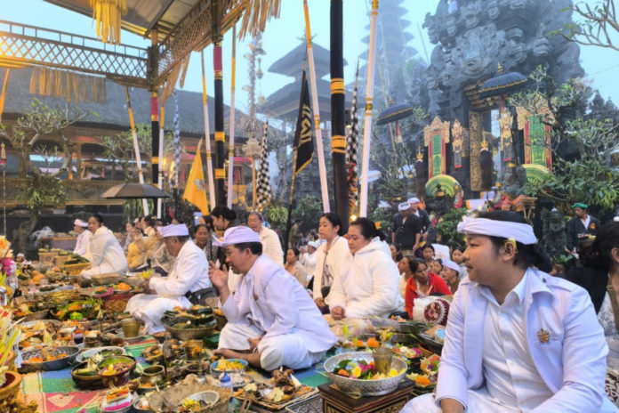 BANGLI, BALIPOST.com – Guyuran hujan deras dan angin kencang tidak menghalangi kekhusyukan krama mengikuti Puncak Pujawali Sasih Kasanga di Pura Alas Arum Batur, Desa Adat Batur, Kintamani Kamis (5/3) sore. Puncak Pujawali yang jatuh pada Pangelong Ping 2 Sasih Kasanga itu dipuput oleh Jero Balian Alas Arum Batur.