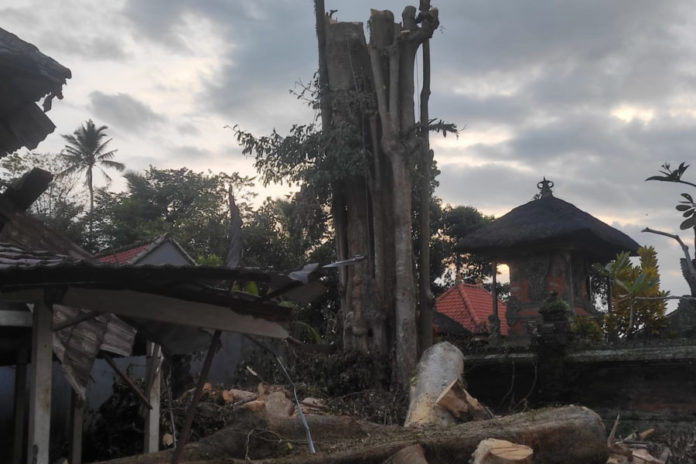 MANGUPURA, BALIPOST.com – Proses pemotongan pohon pule di Wantilan Pura Dalem Desa Adat Denkayu, Desa Werdibhuana, Kecamatan Mengwi, Kabupaten Badung, dilakukan pada Minggu (8/3). Saat batang pohon berhasil dipotong dan jatuh, tukang potong yakni Budi Handoyo (46) asal Lumajang, Jawa Timur (Jatim), ikut terseret tali yang masih terikat pada batang pohon. Akibat kejadian ini, Budi meninggal dunia.