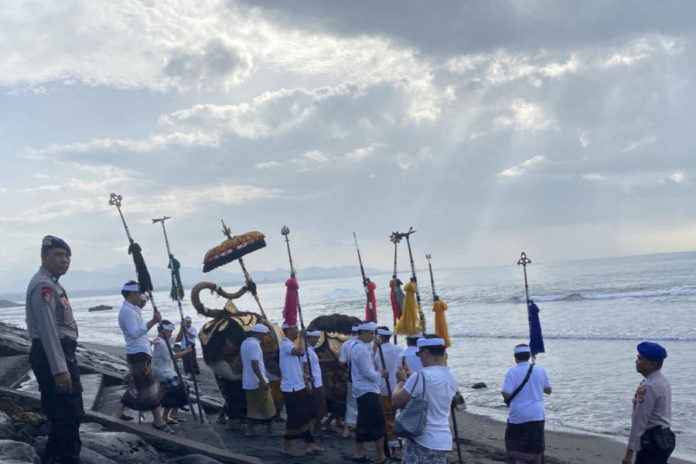 Selain menjaga ketertiban darat, petugas juga melakukan patroli pesisir untuk mengantisipasi potensi bahaya laut. “Kami hadir untuk memastikan seluruh rangkaian ibadah masyarakat berjalan aman dan kondusif. Selain pengamanan, personel di lapangan juga aktif memberikan imbauan agar warga tetap waspada terhadap kondisi pasang surut air laut,” ujar Kasat Polairud Polres Gianyar, AKP I Gede Budarasa.