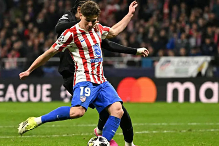 Penyerang Atletico Madrid Julian Alvarez (19) melepaskan tendangan yang menjadi gol pada pertandingan leg pertama babak 16 besar Liga Champions menghadapi Tottenham di Stadion Metropolitano, Madrid, Selasa (10/3) waktu setempat. (BP/Dok. uefa.com)