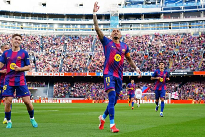 JAKARTA, BALIPOST.com – Penyerang sayap asal Brasil, Raphinha, tampil luar biasa dengan mencetak tiga gol saat FC Barcelona melumat Sevilla FC dengan skor telak 5-2 pada pekan ke-28 La Liga di Camp Nou, Barcelona, Minggu (15/3) waktu setempat.
