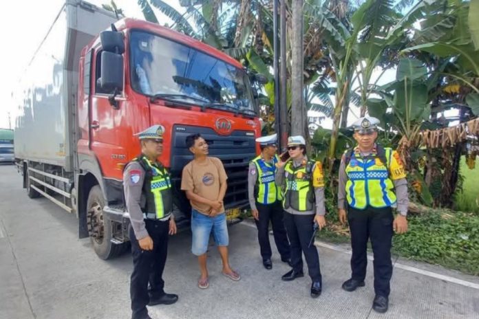 Personel Satlantas Polres Badung sosialisasi SKB 3 Menteri terkait pembatasan operasional kendaraan angkutan barang sumbu tiga. (BP/istimewa)