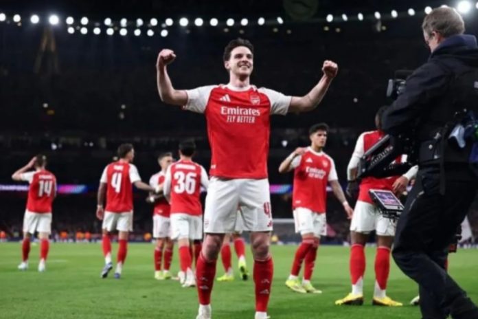 Selebrasi Declan Rice setelah mencetak gol untuk Arsenal dalam pertandingan leg kedua Liga Champions 2025/26 lawan Bayer Leverkusen di Emirates Stadium pada Selasa (17/3). (BP/Dok. UEFA.com)