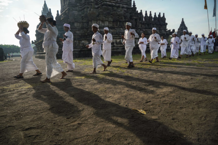 SLEMAN, BALIPOST.com – Ribuan umat Hindu Indonesia mengikuti Upacara Tawur Agung Kesanga Nasional dalam rangka Hari Suci Nyepi Tahun Baru Saka 1948 di kawasan Candi Prambanan, tepatnya di Wisnu Mandala, Rabu (18/3).