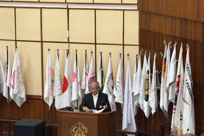 Kepala Bidang Organisasi KONI Pusat, Markus Othniel Mamahit saat memberikan sambutannya pada Musorprov KONI Bali 2026, di Gedung Wiswa Sabha Utama, Kantor Gubernur Bali, Senin (23/3). (BP/win)