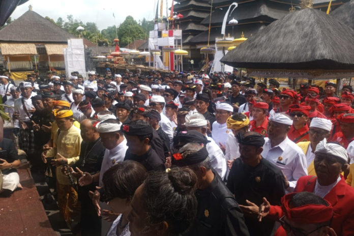 AMLAPURA, BALIPOST.com – Pengukuhan Jagabaya Bali Adung Catur Lawa dan sejumlah pasemetonan lainnya di Besakih secara resmi dilakukan pada, Rabu (25/3). Pengukuhan tersebut ditandai dengan pelaksanaan upacara mejaya-jaya di Pura Penataran Agung Besakih, Desa Besakih, Kecamatan Rendang.