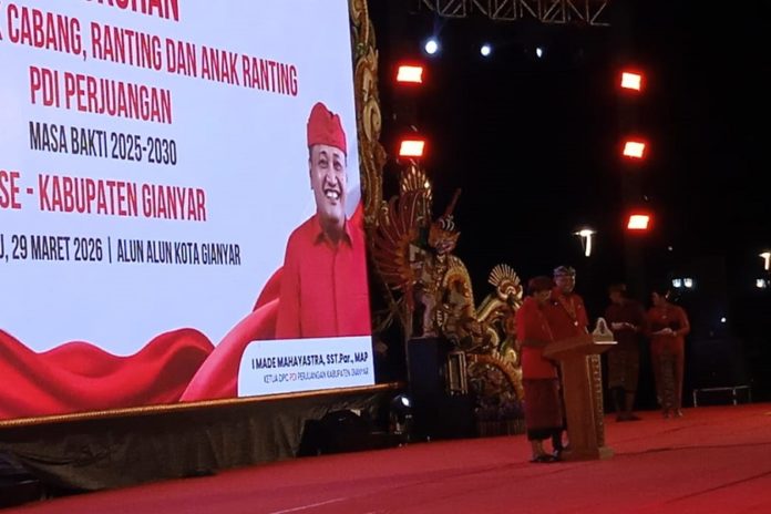 GIANYAR, BALIPOST.com – Ketua DPD PDI Perjuangan Provinsi Bali, I Wayan Koster, mengukuhkan sebanyak 3.298 pengurus anak cabang (PAC), ranting, dan anak ranting se-Kabupaten Gianyar dalam acara yang digelar di Alun-alun Kota Gianyar, Minggu (29/3) petang.