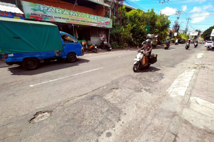 Pengendara motor melintas dengan pelan di Jalan Pulau Nusakambangan, Denpasar yang dibeberapa titiknya retak dan berlubang, Senin (30/3). Selain di jalan tersebut, kondisi rusak juga terjadi di beberapa ruas jalan Kota Denpasar. (BP/eka)