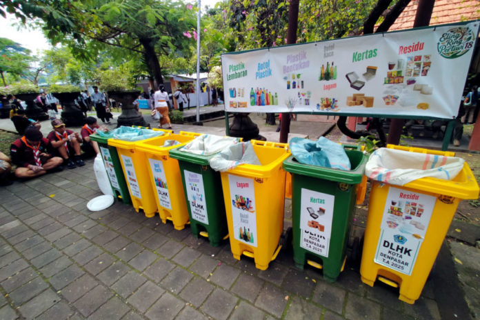 Beberapa siswa/i beristirahat disekitar tempat sampah untuk membantu warga membuang sampah sesuai dengan jenisnya di Lumintang, Denpasar, Jumat (27/2). (BP/eka)