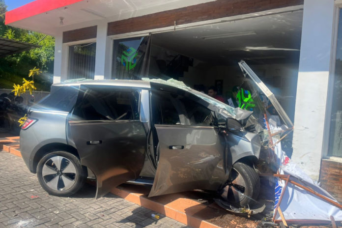 Kasi Humas Polres Kawasan Bandara I Gusti Ngurah Rai Ipda I Gede Suka Artana, S.H., Selasa (14/4) menjelaskan peristiwa tersebut terjadi pukul 14.30 Wita. Kronologisnya bermula saat mobil listrik DK 1989 ADU dikemudikan SLP (57) melaju dari depan SPBU menuju utara dengan kecepatan tinggi. Diduga SLP kehilangan kendali dan menabrak mobil Calya DK 1892 KG dikemudikan INPM (53) asal Gianyar.