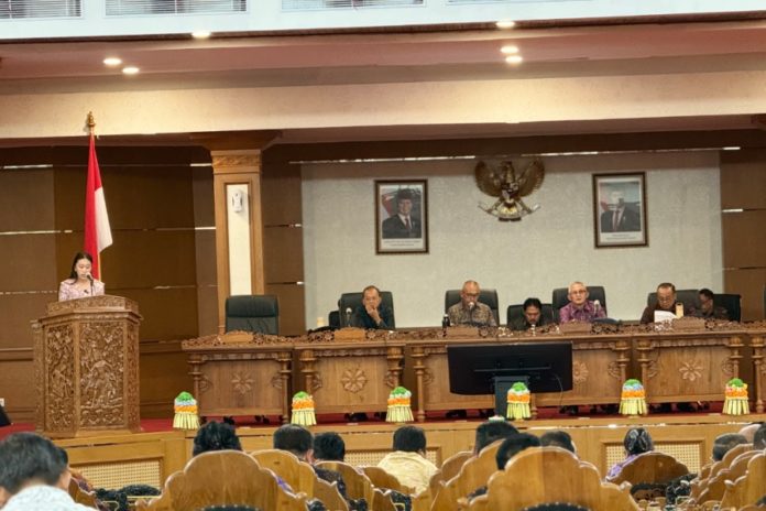 Putu Diah Pradnya Maharani saat membacakan pandangan umum PDI Perjuangan terkait dua Raperda dalam Rapat Paripurna ke-33 DPRD Bali, di Ruang Sidang Utama Kantor DPRD Bali, Selasa (14/4). (BP/win)