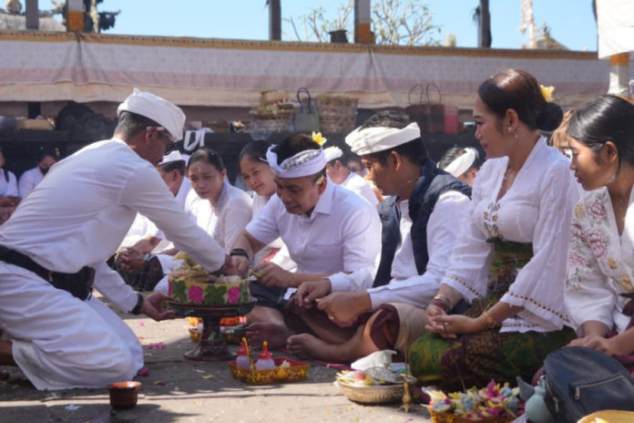 NEGARA, BALIPOST.com – Dalam rangkaian upacara Ida Bhatara Turun Kabeh (IBTK) di Pura Agung Besakih, jajaran Pemerintah Kabupaten (Pemkab) Jembrana melaksanakan prosesi persembahyangan bhakti penganyar pada Jumat (17/4). Kegiatan ini dipimpin langsung oleh Bupati Jembrana, I Made Kembang Hartawan didampingi Wakil Bupati Jembrana, I Gede Ngurah Patriana Krisna.