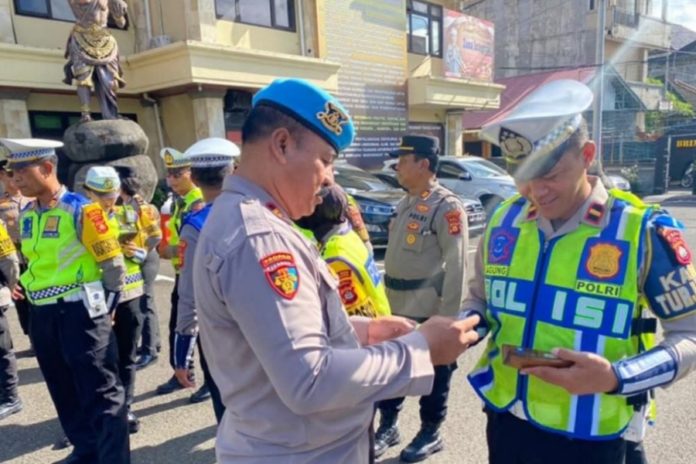 Kasi Propam Polres Badung, Iptu I Wayan Sukarma mengecek surat-surat milik anggota.(BP/istimewa)