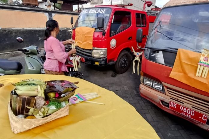 Salah satunya upacara Tumpek Landep yang berlangsung di Dinas Pemadam Kebakaran (Damkar) dan Penyelamatan Kota Denpasar, Sabtu (18/4).