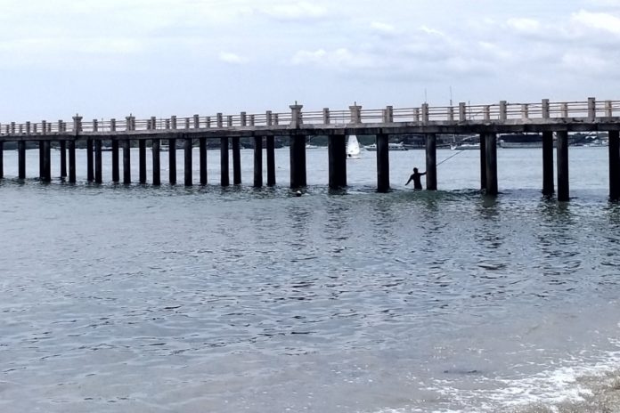 Salah seorang warga beraktifitas di dekat dermaga di Pantai Mertasari, Denpasar. (BP/eka)