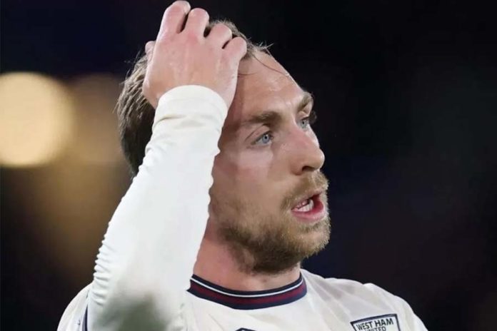 Penyerang West Ham Jarrod Bowen bereaksi seusai pertandingan Liga Inggris menghadapi Crystal Palace di Stadion Selhurst Park, London, Senin (20/4) waktu setempat. (BP/Dok. Premierleague.com)