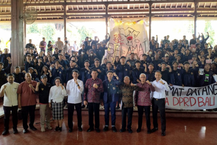 DENPASAR, BALIPOST.com – Ratusan mahasiswa yang tergabung dalam Badan Eksekutif Mahasiswa Universitas Udayana (BEM Unud) mendesak pemerintah daerah menyelesaikan krisis sampah di Bali. Dalam dialog terbuka di Wantilan DPRD Bali, Rabu (22/4), mahasiswa secara resmi menyerahkan lima rekomendasi kebijakan strategis pada Gubernur Bali, Wayan Koster dan Ketua DPRD Bali Dewa Made Mahayadnya.