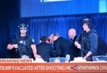 Trump dan sejumlah pejabat yang duduk di meja utama dikawal keluar oleh agen Dinas Rahasia, sementara tamu lainnya tetap berada di dalam ruangan acara.
