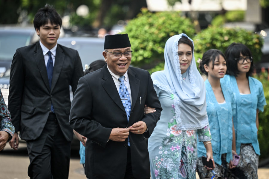 Menteri Lingkungan Hidup Jumhur Hidayat (kedua kiri) bersama keluarganya berjalan menuju ruang pelantikan pejabat baru dalam Kabinet Merah Putih di Istana Negara, Jakarta, Senin (27/4/2026). (BP/Antara)
