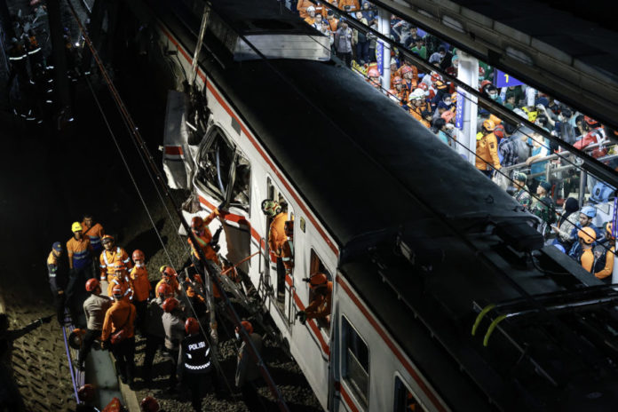 JAKARTA, BALIPOST.com – Sebanyak tiga penumpang masih terjepit dan petugas tim SAR gabungan menerapkan skema bergantian untuk menyelamatkan korban dengan memotong besi rangkaian gerbong KRL di Stasiun Bekasi Timur, Bekasi, pada Selasa (28/4) pagi 05.53 WIB.