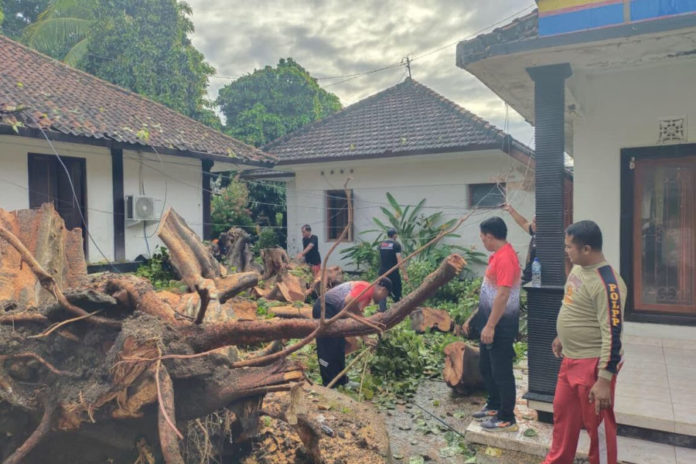SINGARAJA, BALIPOST.com – Hujan deras yang mengguyur wilayah Kecamatan Kubutambahan, pada Senin (27/4) sore menyebabkan sebuah pohon jenis ancak tumbang. Tumbangnya pohon berukuran besar itu, menimpa bagian atap ruang pelayanan terpadu Kantor Camat Kubutambahan.